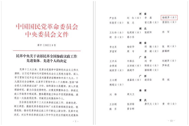近日,中国国民革命委员会中央委员会下发了《民革中央关于表彰民革全国参政议政先进集体和先进个人的决定》,对五年来全国在参政议政中做出突出贡献的110个“先进集体”和248位“先进个人”进行了表彰。民革河南省委委员、河南省人大代表,民革河南工业大学基层委员会主委杨艳萍获此殊荣,是河南高校中的唯一获得者。