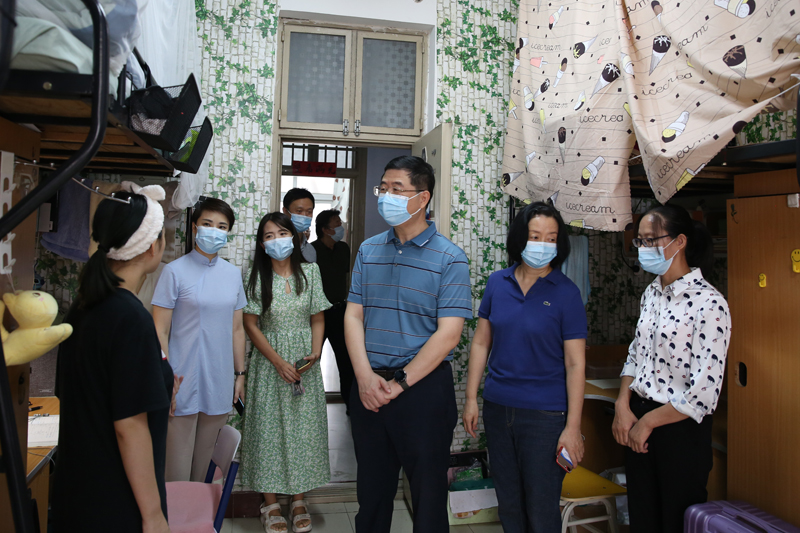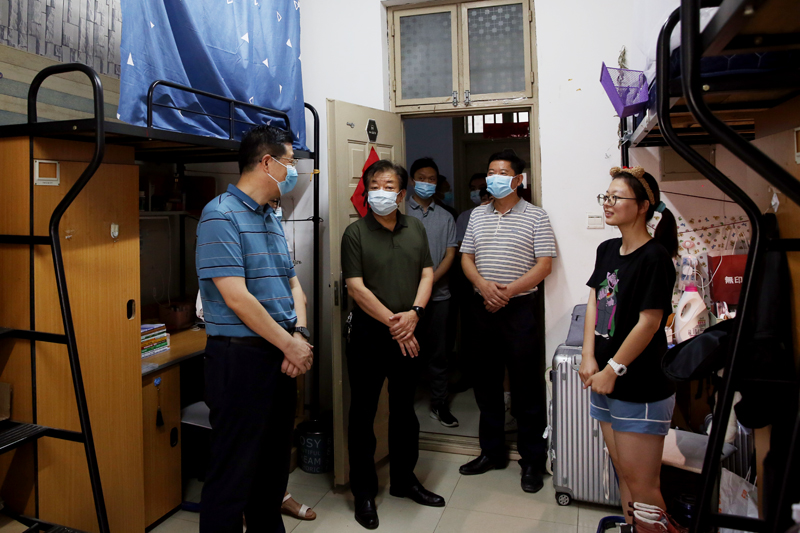 刘志军一行先后走访了B区女生公寓、C区男生公寓。他关切地询问了洪水疫情给同学们带来的影响,耐心地了解同学们的学习情况和生活困难,仔细聆听同学们的各方面需求。在看到留校学生都在认真备考研究生时,他亲切地和同学们交流报考的院校以及复习方法;当他了解到因疫情防控需要,同学们无法使用图书馆和自习室,只能在宿舍学习的情况时,刘志军建议学校相关部门在遵守疫情防控规定,合理控制人数,保证学生安全的前提下,适当开放教室供同学们学习。