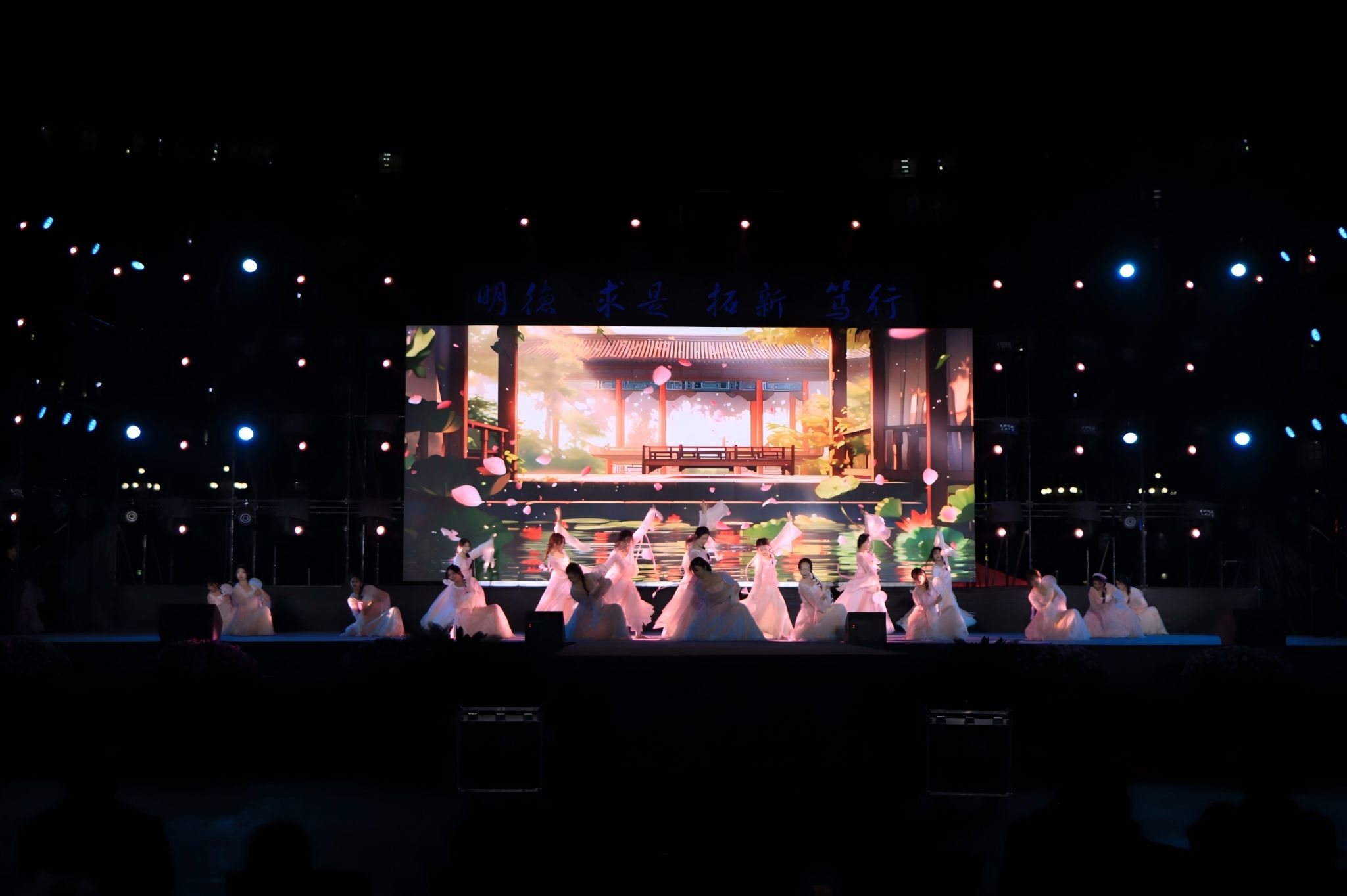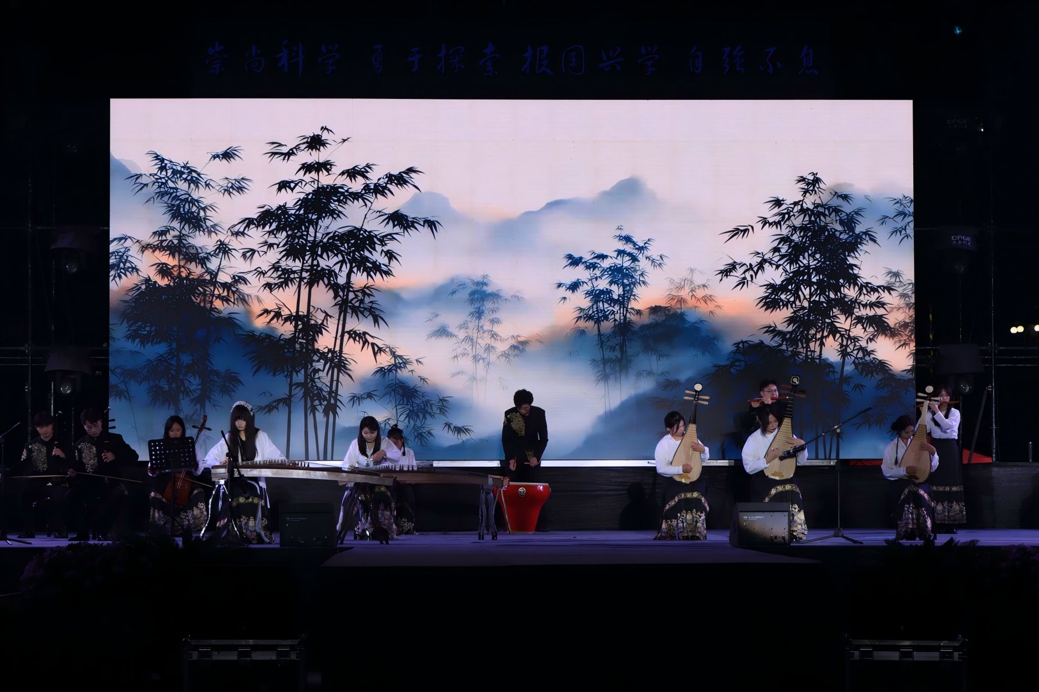 “同心聚力绽新彩”聚焦协作与创新,展现多元文化魅力。管弦乐《濯海令》以恢弘旋律描绘了“百川归海”的壮阔意境;《阿刁》《青春舞曲》《相思瑶》等歌曲联唱,展现了民族文化的魅力与奋斗活力;古典舞《清庭云月》以优雅舞步诠释传统美学;创意走秀《四时序》则将大学四年的成长历程巧妙融入四季变换的诗意叙事之中。
