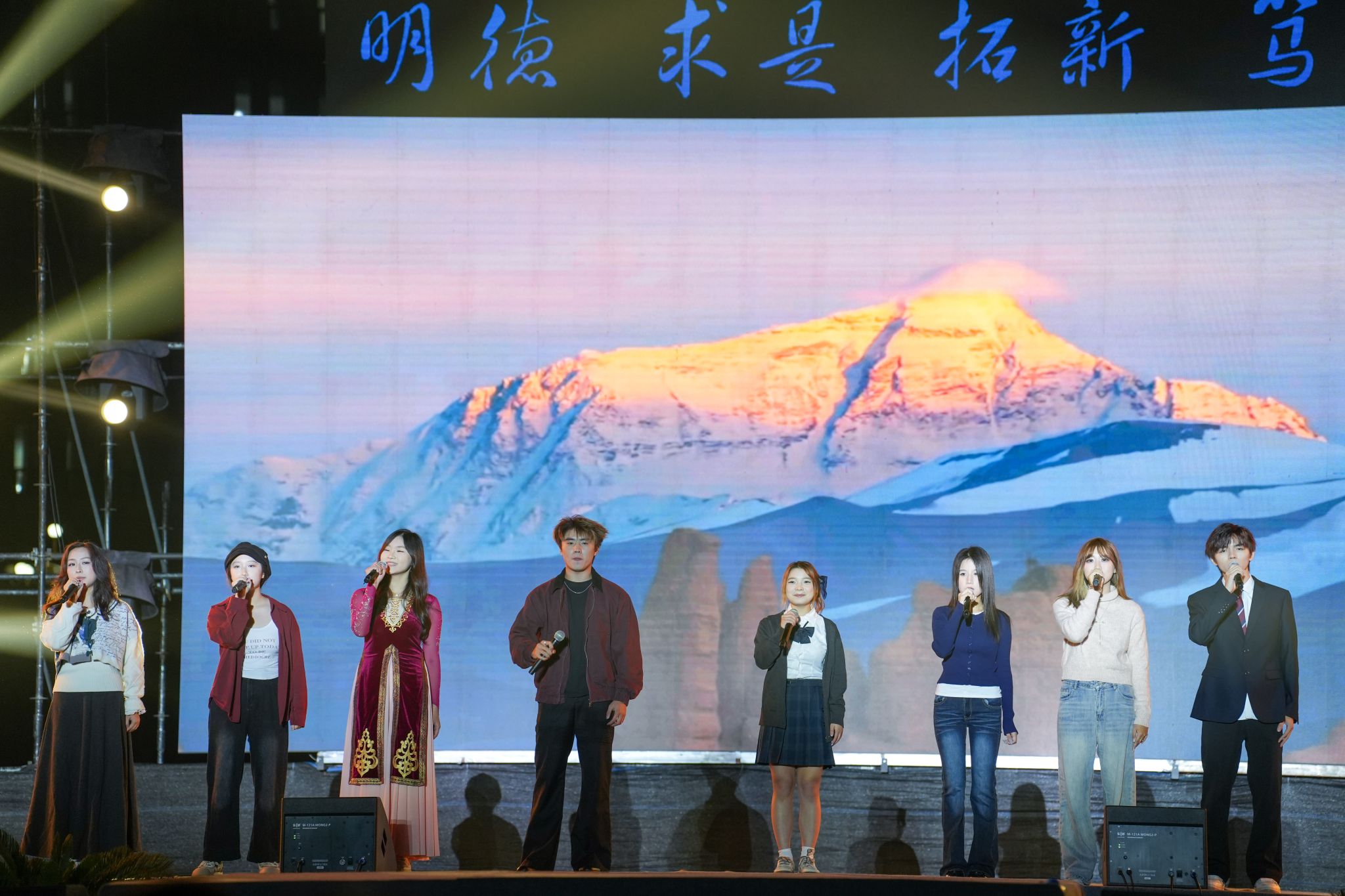 “挺膺担当谱新篇”以青春担责为主题,点燃奋斗责任与激情。西洋乐合奏《游击队之歌》《红旗颂》以激昂乐章回望历史,播撒担当的种子;互动歌曲《大梦想家》掀起晚会高潮,“准备好成为独一无二的大梦想家了吗?”的提问引发全场呐喊,欢快旋律中满是“敢梦敢闯”的青春朝气;朗诵《雪落在中国的土地上》让艾青笔下的家国情怀缓缓流淌,引导新生在文字力量中感悟深沉的家国情怀;街舞《奇妙的惊喜》则以欢快节拍传递出以青春践行使命的积极态度。