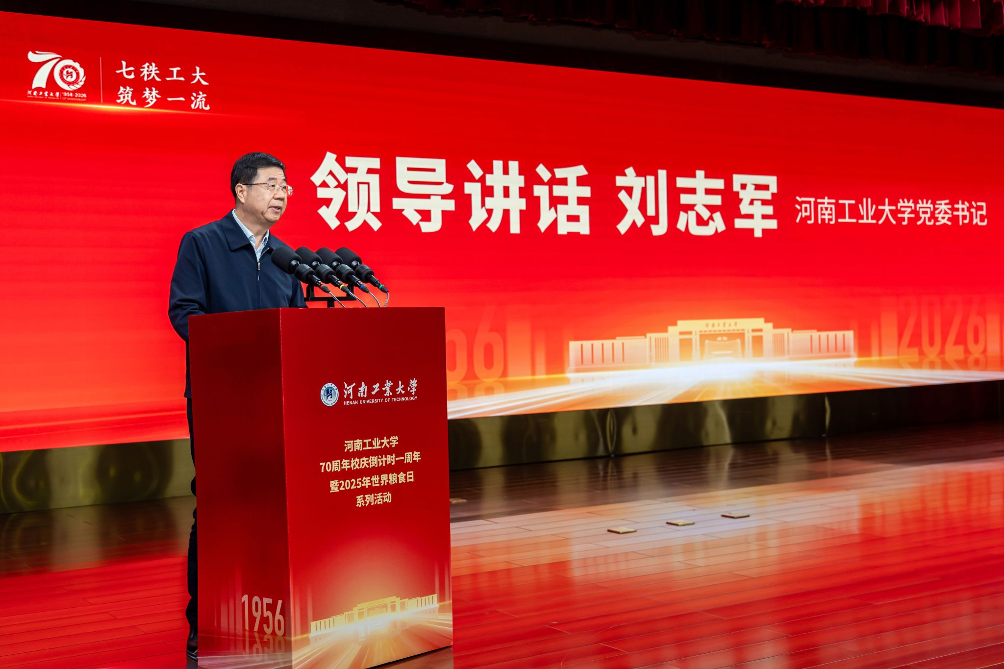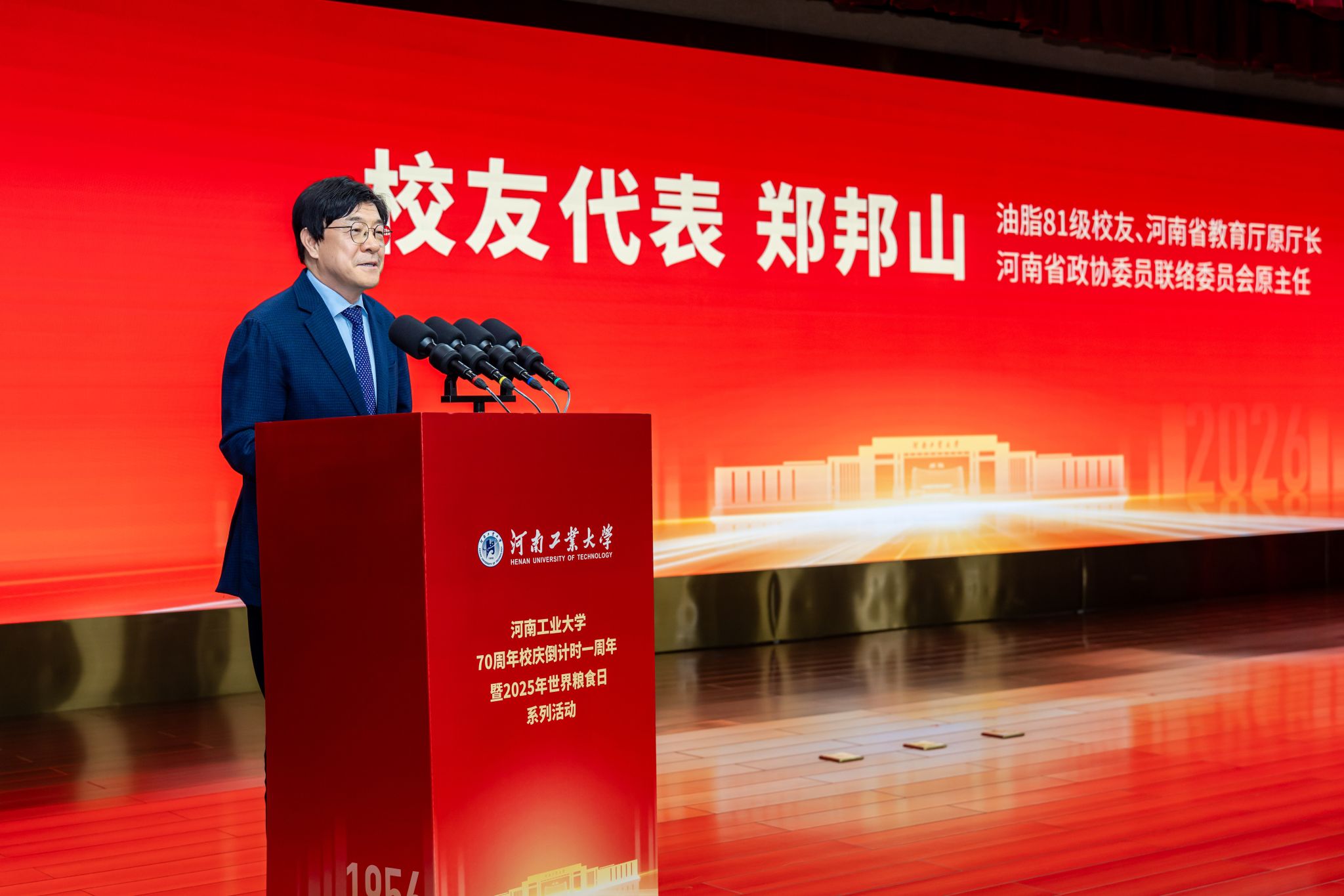 七秩风华,薪火相承。10月16日,“河南工业大学70周年校庆倒计时一周年暨2025年世界粮食日系列活动”在莲花街校区学术报告中心D303报告厅举行。全体在校校领导、特邀嘉宾、中层干部、离退休老同志、校友代表、师生代表齐聚一堂,共同见证这一重要时刻。活动共分四个阶段,第一阶段为“70周年校庆倒计时一周年活动”,由校党委副书记黄泽峰主持。