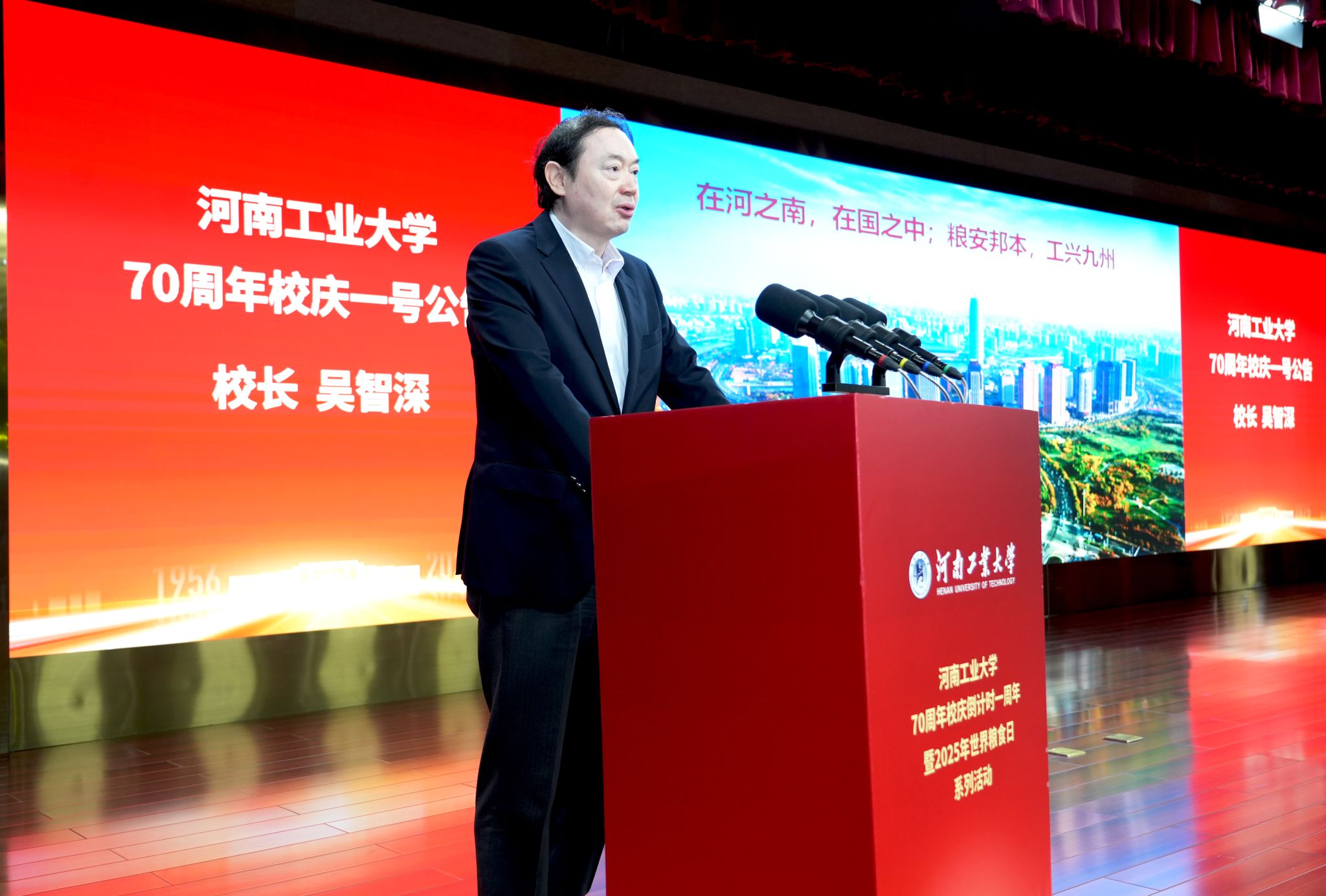 会上,校长吴智深现场宣读校庆一号公告。公告回顾了学校“薪火相承,兴学报国”的办学历史,勾勒了学校“粮安邦本,工兴九州”的奋进画卷,发出了“广聚贤达,同擘宏图”的真挚邀约。公告宣示河南工业大学将以70周年校庆为契机,回眸一路芳华,展望美好愿景,凝聚奋进共识,广结深情厚谊,开启特色鲜明的一流工业大学建设新篇章。