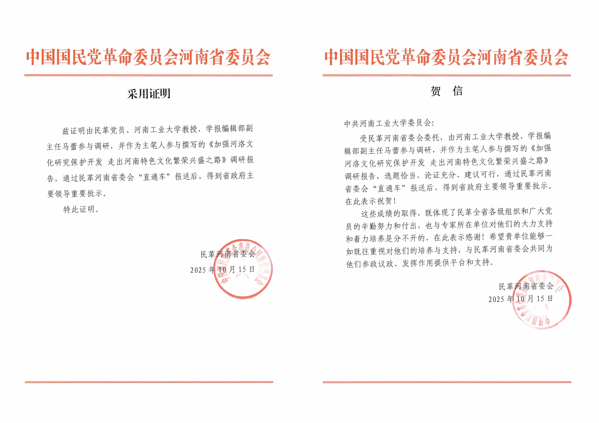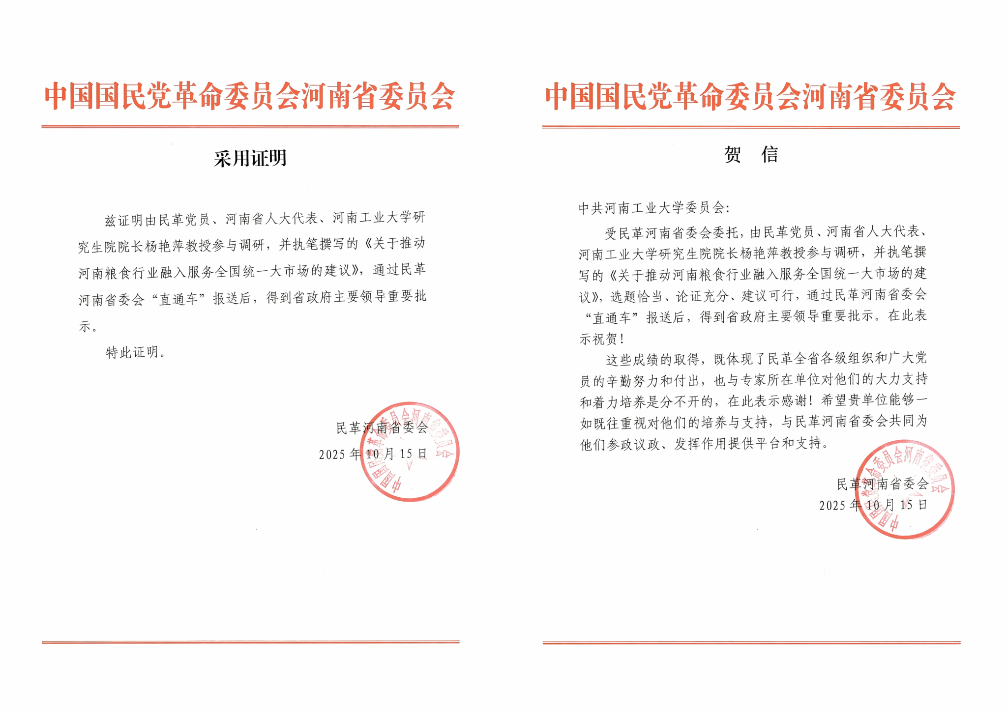 近日,民革河南省委员会发来贺信,我校两项调研报告获省长王凯肯定性批示。受民革河南省委委托,分别由民革省委河南工业大学委员会主委、研究生院院长杨艳萍教授执笔撰写的《关于推动河南粮食行业融入服务全国统一大市场的建议》,民革党员、学报编辑部副主任马蕾教授执笔撰写的《加强河洛文化研究保护开发 走出河南特色文化繁荣兴盛之路》,选题恰当、论证充分、建议可行,通过民革河南省委会报送后,10月11日获得省长王凯重要批示,并要求省主管职能部门在工作中加以采纳,为助推我省粮食行业高质量融入服务全国统一大市场,推进文化强省建设塑造文化繁荣兴盛的新标杆向兴赋能。