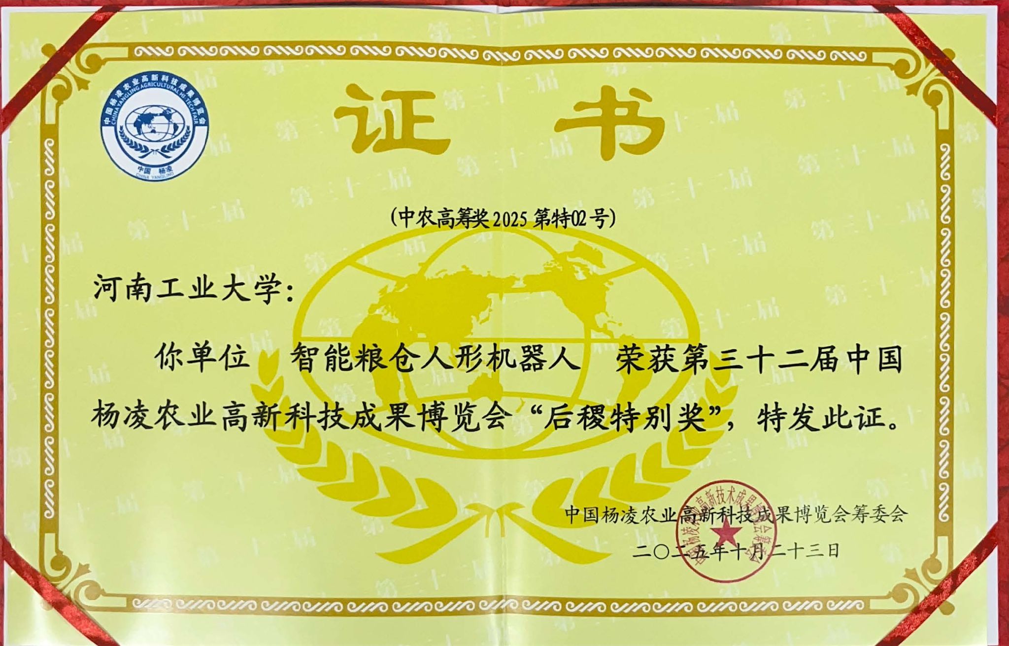 高校与科研院所作为农业机器人技术创新的核心源头,在本次活动中展现强劲实力。河南工业大学智能无人系统及装备团队与中豫具身智能实验室联合研发的参赛项目——“智能粮仓人形机器人(粮宝二号)”,在展区及赛事现场凭借独特的应用场景适配性与硬核技术实力,不仅与观众展开热情互动,更吸引评委与央视镜头长时间聚焦。作为国内首款深度贴合粮仓场景全流程作业需求的人形机器人,“粮宝二号”直面粮仓复杂地形、高粉尘环境等行业核心痛点,成功实现粮库内粮情监测、设备协同、应急响应的全流程无人化作业,为不同类型粮仓的复杂作业场景及未知极端工况下的粮食安全提供了可靠技术保障。经过激烈角逐,该项目最终脱颖而出,荣获第三十二届中国杨凌农业高新科技成果博览会 “后稷特别奖”,彰显了学校在粮食智能装备领域的创新突破。