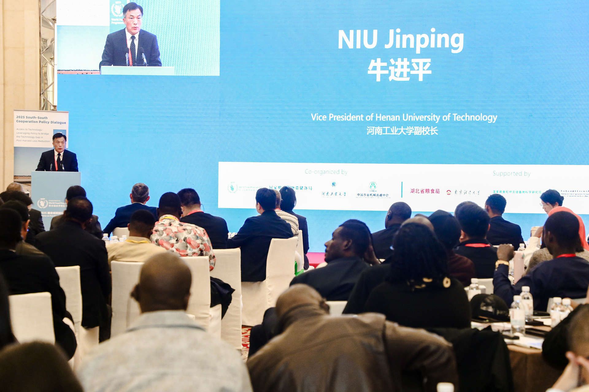 牛进平代表河南工业大学致辞。他指出,河南工业大学始终将保障粮食安全作为使命,不仅为国家粮食安全提供了有力支撑,更以实际行动响应“全球发展倡议”。学校作为全球唯一覆盖粮食产后全学科的高校,已为“一带一路”沿线120多个国家培训官员和技术人员3600余人。学校愿与全球伙伴一道,深化粮食减损关键技术的联合研发与推广应用,共同为提升全球粮食体系的韧性与可持续性、注入新动力。