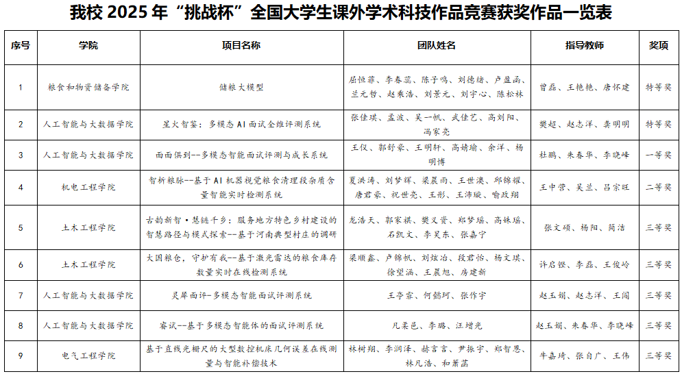 近日,由共青团中央、中国科协、教育部、中国社科院、中国工程院、全国学联和江苏省人民政府共同主办的第十九届“挑战杯”全国大学生课外学术科技作品竞赛落下帷幕。我校最终在2025年度“挑战杯”各类比赛中斩获9项国奖,其中特等奖2项、一等奖1项、二等奖1项、三等奖5项。