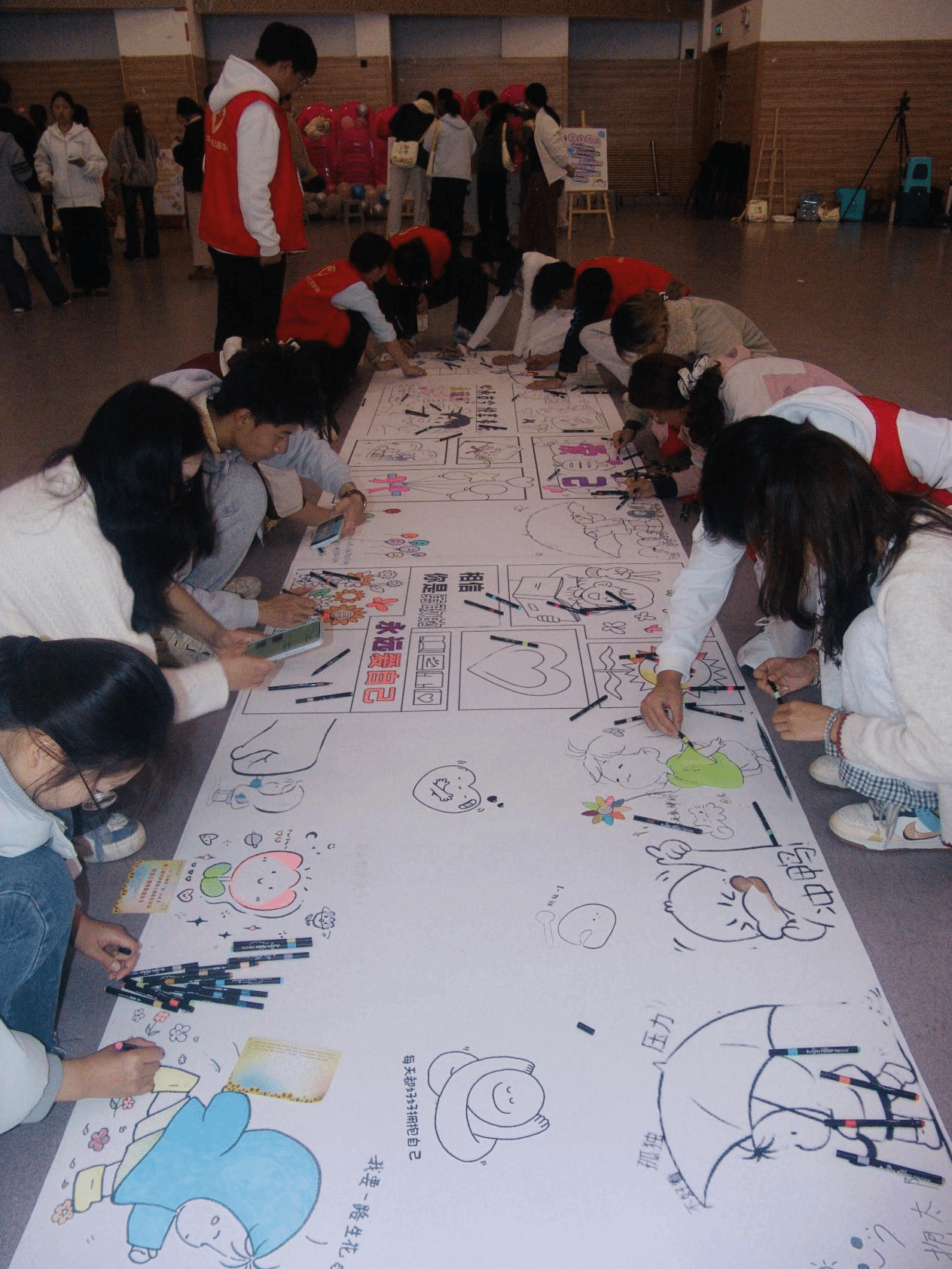 论坛开幕式后,“随音而动”艺术疗愈活动正式拉开本届论坛的体验环节。在聚能慧创体验式培训中心柴超伟培训师的带领下,同学们在“我抓我逃”的活动中训练倾听和反应能力,在欢快的洗衣舞中舒展身心。“心承古今·悦享多元”心理文化节设有三大主题园区,涵盖AI情绪疗愈、专注力训练、非遗手工、团体绘画等20项互动内容。在“雅静品艺·沉浸心享空间”,参与者通过AI情绪疗愈舱体验智能反馈与情绪可视化;“巧艺筑梦·多元手作工坊”将心理调适与美育实践相融合;压轴的“众笔绘心·共享心灵长卷”活动,以大型画布为媒介,与会师生共同执笔、自由绘写。整场活动融合科技、传统、艺术与协作,既提升个体心理素养,也凝聚群体心理能量,让心理委员们在体验中学习、在乐趣中成长、在互动中传播。