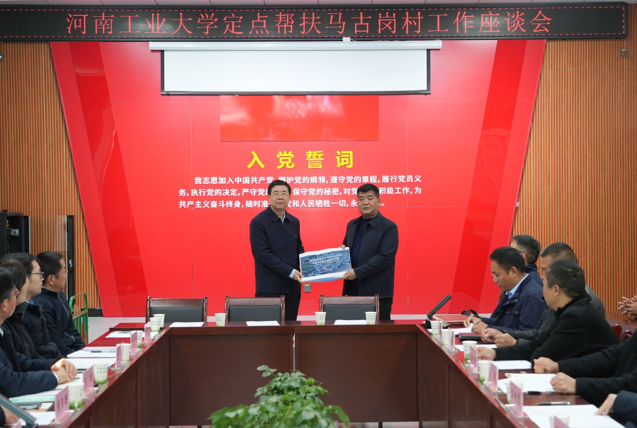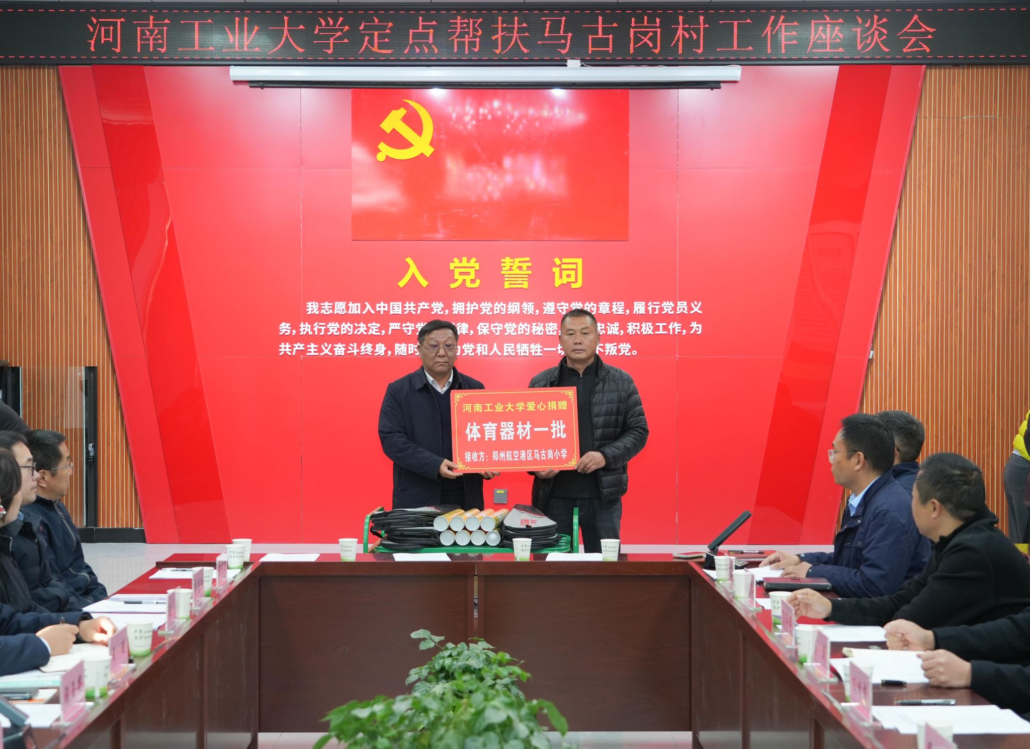 在马古岗村党群服务中心,刘志军听取了学校派驻马古岗村第一书记郭少东的工作汇报,并向马古岗村捐赠了土木工程学院设计的《马古岗村河道下水道工程设计方案》。张玉安向马古岗小学捐赠了一批体育运动器材。参会的相关领导为马古岗村安全巡逻队成员发放了棉衣。