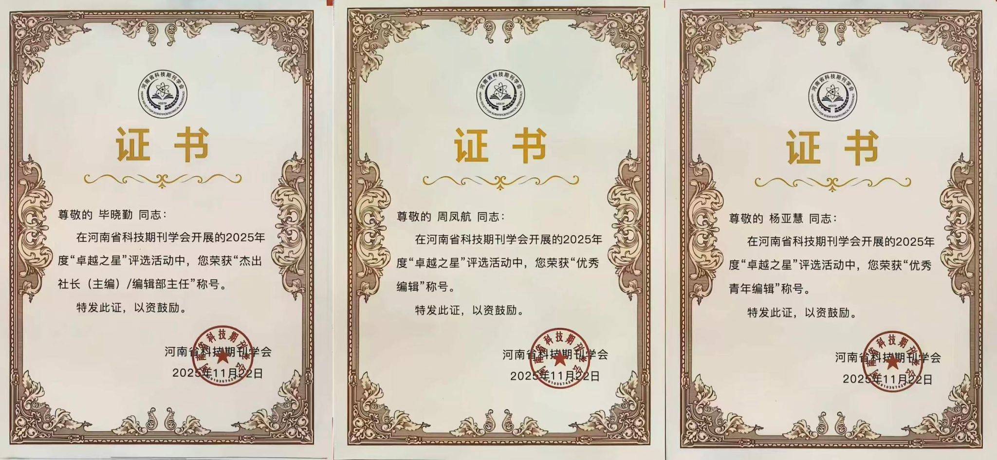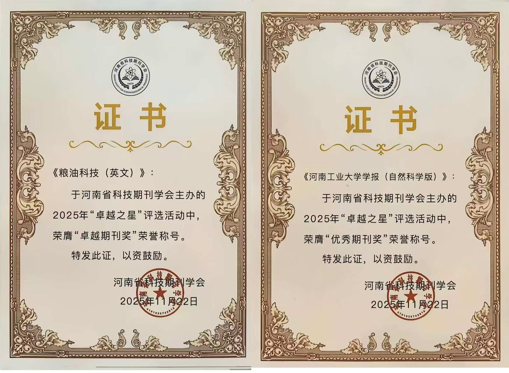 11月21日至22日,河南省科技期刊学会2025年会员大会、第二届学术研讨会暨“科创中原”重点学术交流活动在郑州召开。为表彰在期刊管理、编辑业务及期刊建设中做出突出贡献的个人与集体,河南省科技期刊学会设立了2025年“卓越之星”7项评选奖项,河南工业大学学报编辑部荣获5项荣誉:《粮油科技(英文)》获评卓越期刊;《河南工业大学学报(自然科学版)》获评优秀期刊;毕晓勤同志获评杰出社长(主编);周凤航同志获评优秀编辑;杨亚慧同志获评优秀青年编辑。