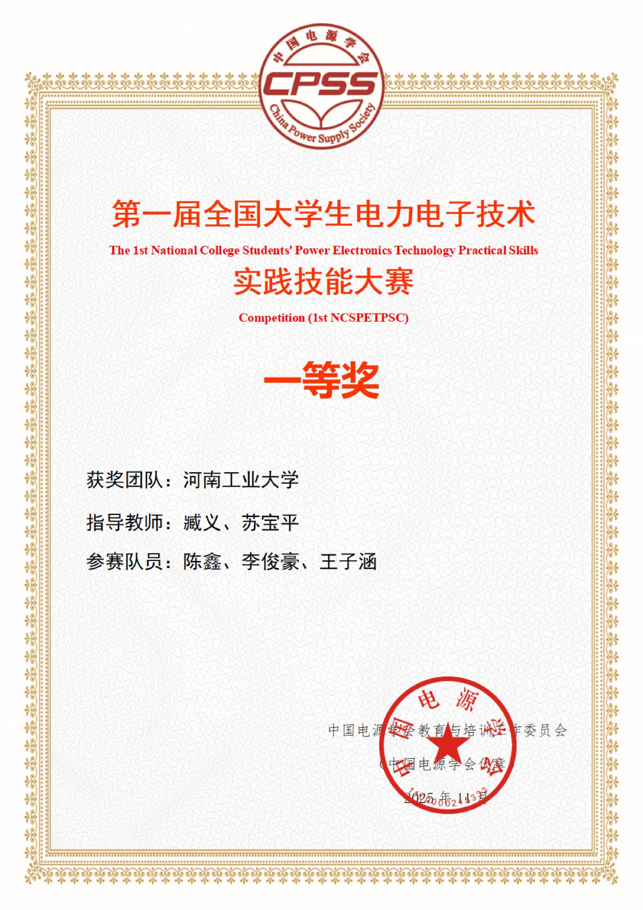 11月30日,第一届全国大学生电力电子技术实践技能大赛决赛在西安交通大学收官。我校电气工程学院电气工程及其自动化专业学子不负众望,在臧义、苏宝平两位老师的悉心指导下,凭借扎实的专业功底和出色的实践能力,荣获全国一等奖,更以一等奖第一名的优异成绩摘得大赛最高荣誉“实践杯”。