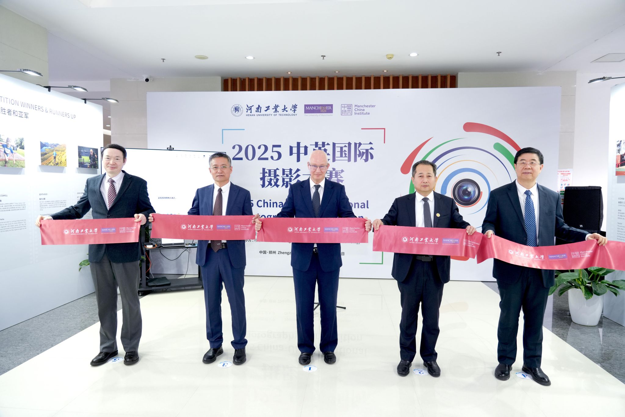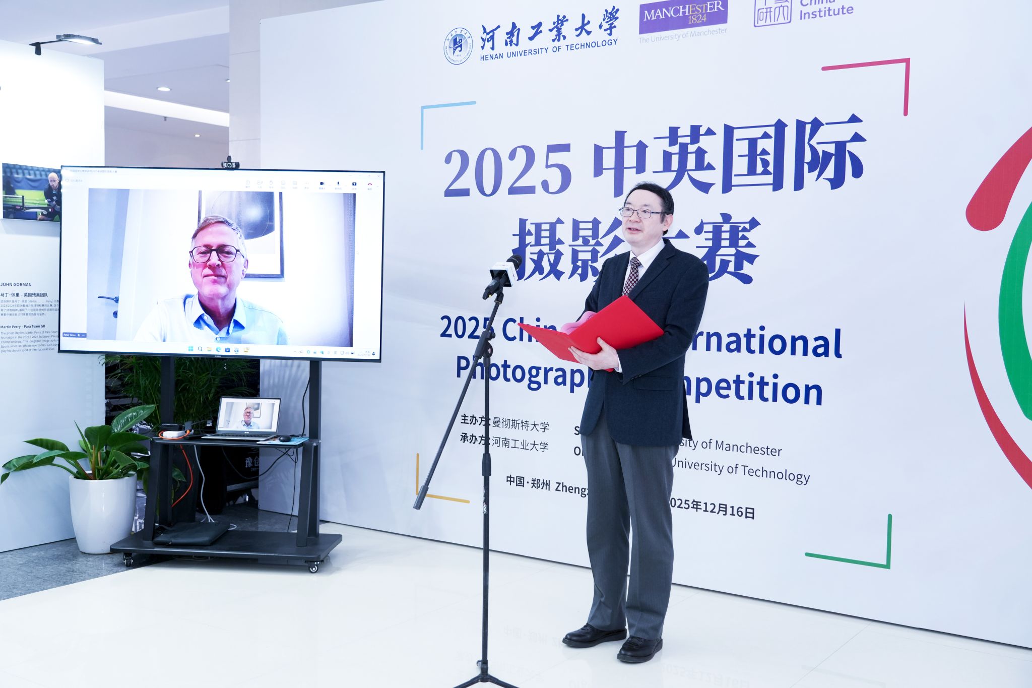 14时35分,摄影展剪彩仪式在办公楼展厅举行,校长吴智深主持摄影大赛开幕式。魏磊大使在致辞中充分肯定了中英两国在人文交流与教育合作方面取得的成就,并特别赞扬了河南工业大学在中英高校合作中发挥的积极作用。英国曼彻斯特大学中国研究院院长葛小伟教授通过视频连线致辞,他介绍了摄影大赛的创办初衷与本届评选情况,强调影像艺术在促进跨文化理解中的独特价值。