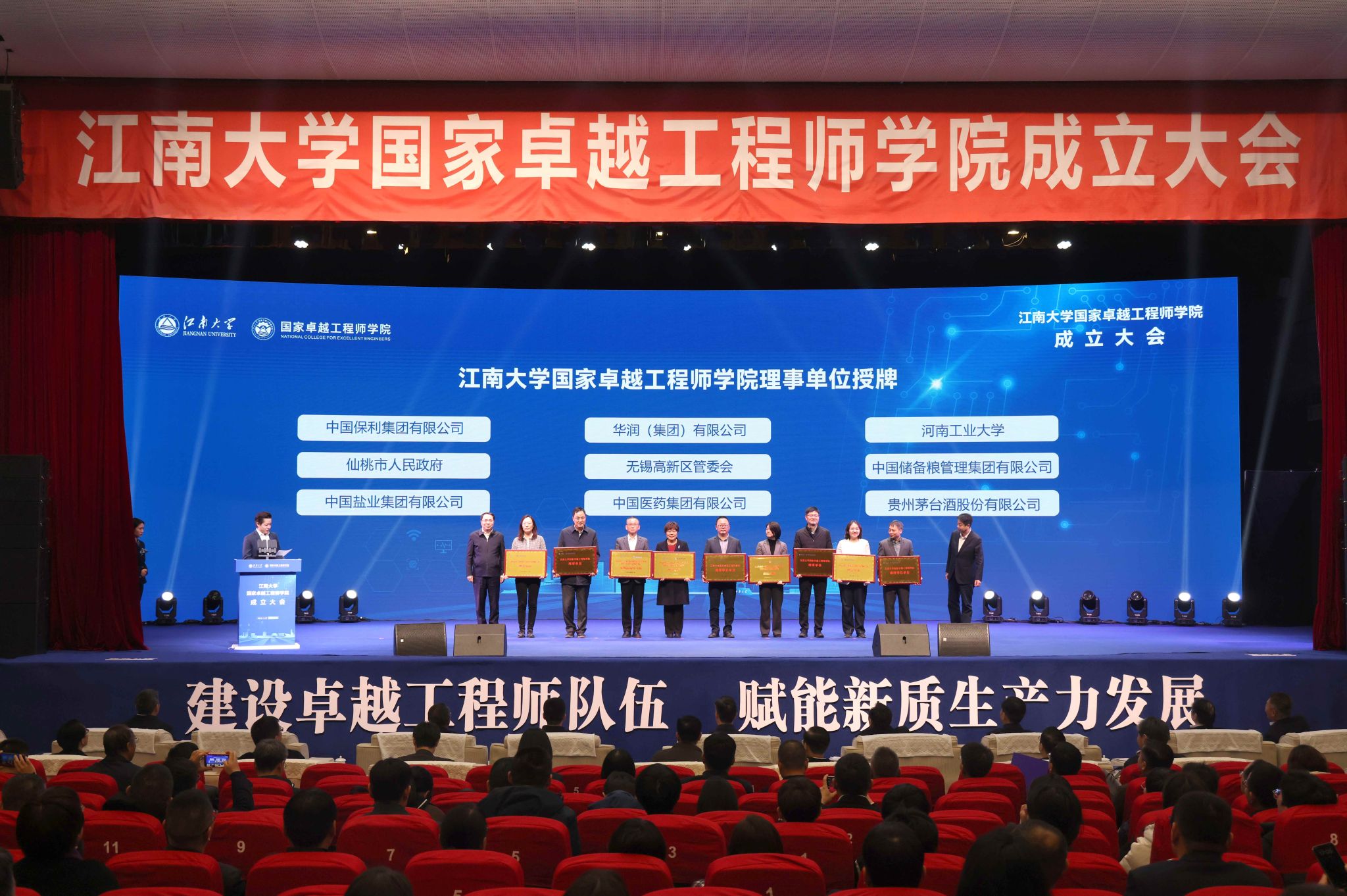 12月29日,江南大学国家卓越工程师学院成立大会及江南大学-河南工业大学共建国家卓越工程师学院授牌仪式在江苏无锡隆重召开。我校校长吴智深、研究生院及卓越工程师学院负责人受邀出席大会。大会由江南大学校党委常委、副校长、国家卓越工程师学院院长马鑫主持,教育部学位管理与研究生教育司副司长郝彤亮、江苏省教育厅二级巡视员吴仁林、无锡市人民政府市长蒋锋,以及中国保利集团有限公司、华润微电子有限公司、贵州茅台酒股份有限公司等企业代表,上海交通大学、同济大学、东南大学等高校领导,江南大学党委书记吴正国、校长、中国工程院院士陈卫等校领导及师生代表1000余人出席。