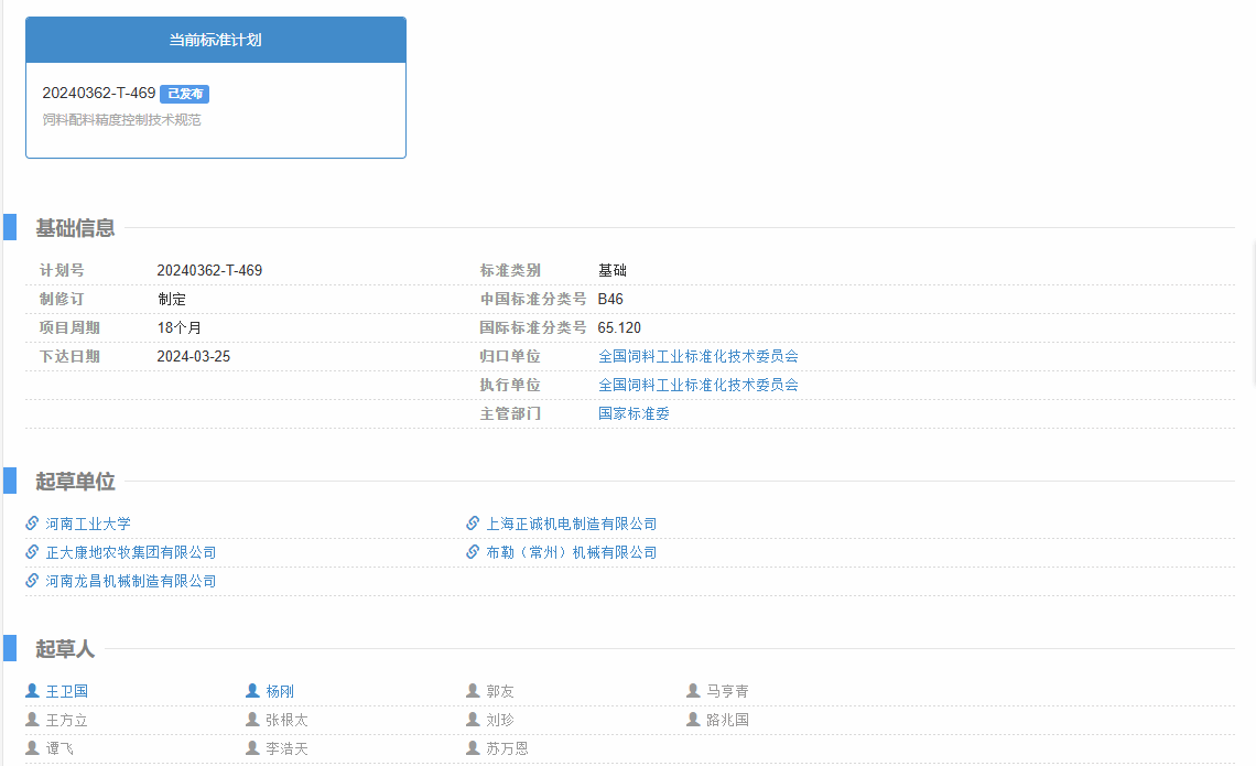 2025年12月31日,由我校王卫国教授主持制订的推荐性国家标准《饲料配料精度控制技术规范》获国家市场监督管理总局、国家标准化管理委员会批准发布,标准号为:GB/T 46930-2025,2026年7月1日起实施。