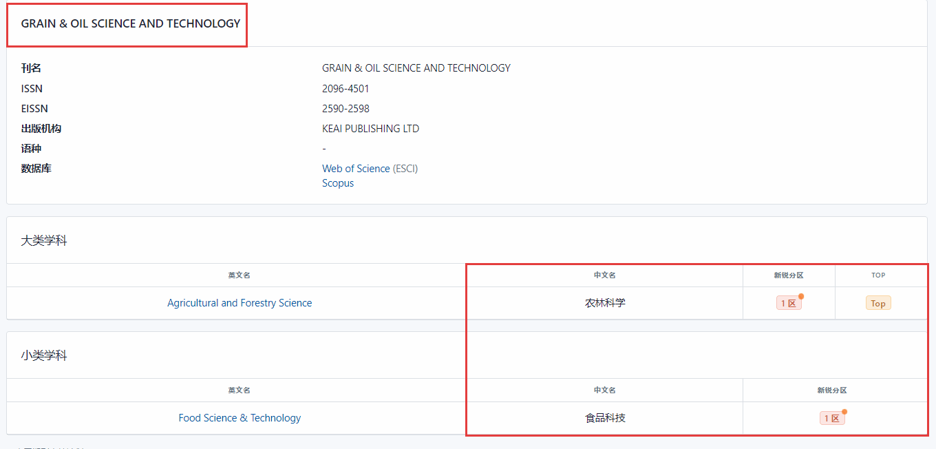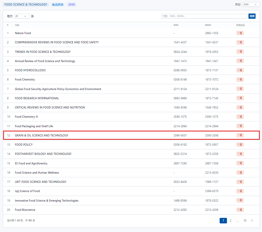 近日,由新锐学术研制的《新锐期刊分区表》(简称“新锐分区”,原中科院分区表)正式推出。Grain & Oil Science and Technology《粮油科技(英文)》入选“农林科学”(大类学科)一区(Top期刊),并入选“食品科技”(小类学科)一区,其中“食品科技”类共入选185种期刊,一区有21种,《粮油科技(英文)》排名一区第12位。