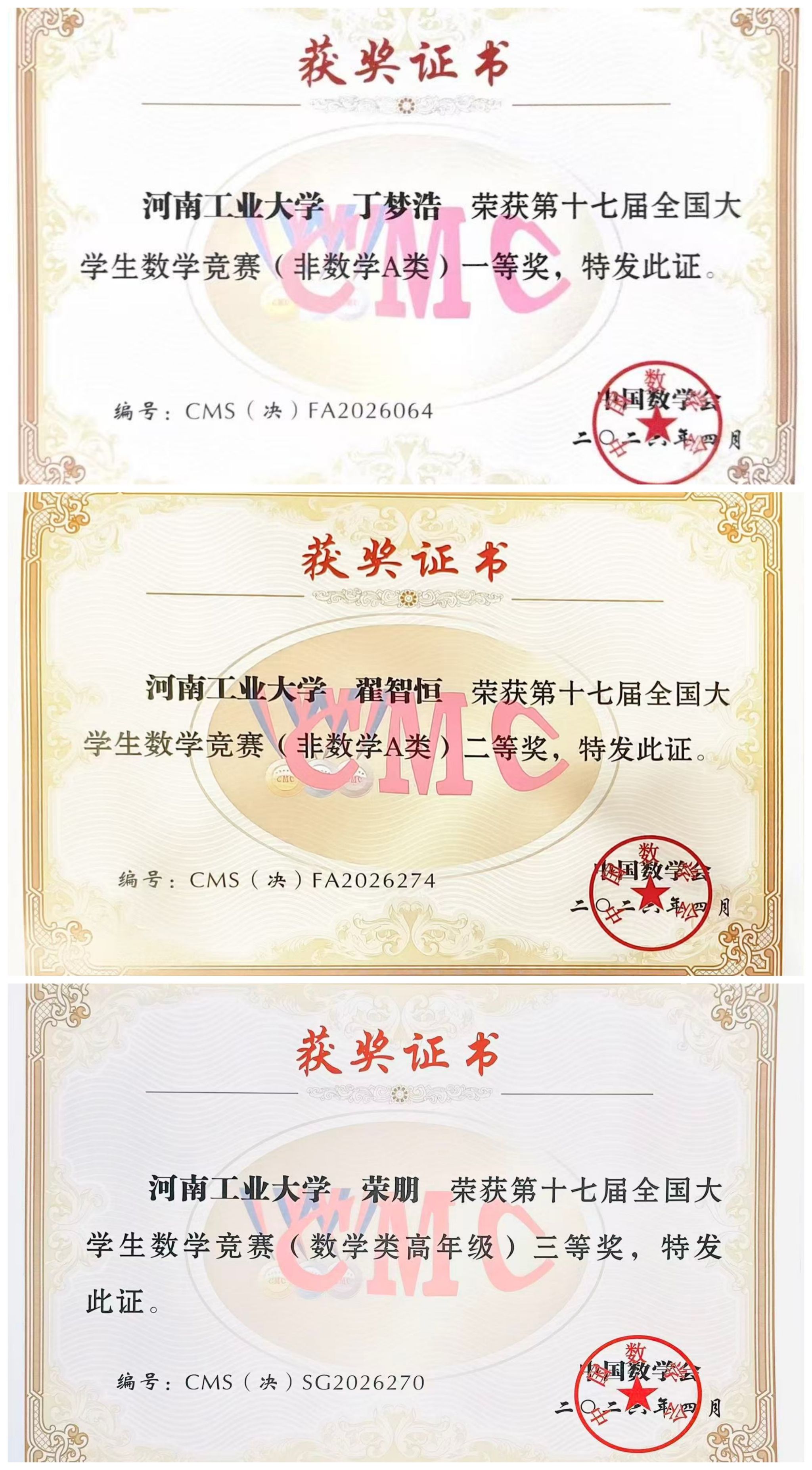 4月17日至19日,由中国数学会主办的第十七届全国大学生数学竞赛决赛在四川成都举行。本次竞赛由四川大学承办,成都理工大学、四川省数学会协办。在此次竞赛中,我校学子表现突出,3名参赛选手全部获奖,共获得全国一等奖、二等奖、三等奖各1项,获奖级别和数量实现历史性突破,创下学校参加该赛事以来最佳成绩!其中2022级计算机科学与技术专业丁梦浩获非数学A类全国一等奖、2022级人工智能专业翟智恒获非数学A类全国二等奖 、2022级数学与应用数学专业荣朋获数学专业组(高年级)全国三等奖。
