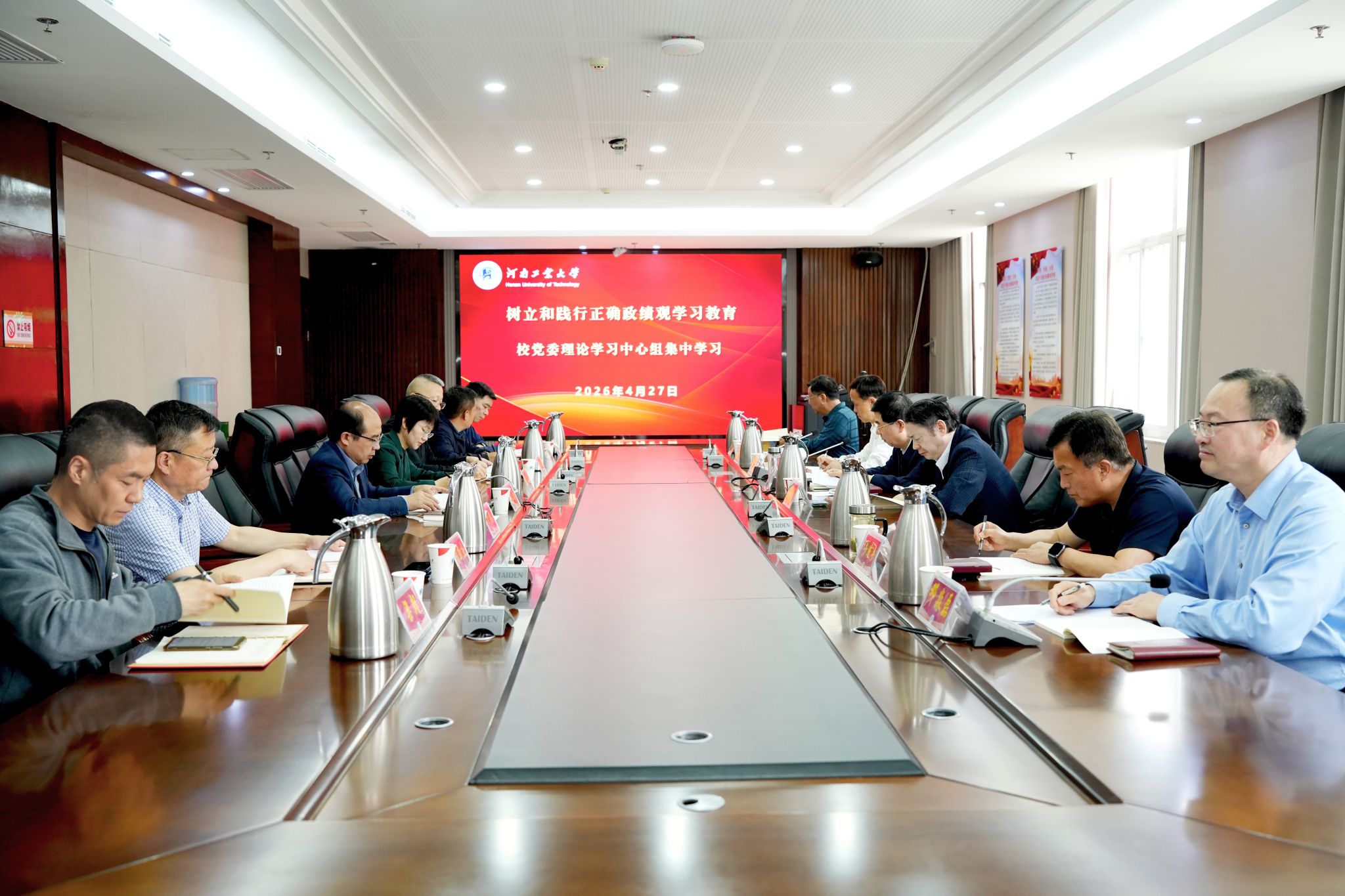 4月27日上午,校党委理论学习中心组在行政楼A515会议室召开集中学习会,围绕“政绩为谁而树”这一专题开展集体学习研讨。校领导、校党委常委、相关部门负责同志参加了会议。会议由校党委书记刘志军主持。