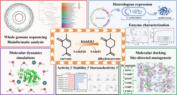 二氢香芹酮具有怡人的香气和多样的生物活性,已被广泛应用于食品、化妆品、药品及精细化学品生产、农业生产和粮油储藏,综合市场需求量大。酶催化因具有立体选择性高且环境友好等优势,已成为生产二氢香芹酮的重要方法之一。该研究基于团队前期筛选得到的菌株,通过生物信息学手段挖掘到潜在的香芹酮烯还原酶KlebER3。经异源表达和蛋白纯化,系统表征了香芹酮烯还原酶KlebER3,并通过计算机辅助手段结合定点突变技术进一步获得了催化活性、稳定性及立体选择性显著提升的突变体。最后利用分子动力学模拟揭示了其活性和稳定性增强的潜在机制。本研究表征的烯还原酶展现出卓越性能,具有较强工业规模应用的潜力;并通过拓展烯还原酶资源库,为后续合成生物学和基因工程应用奠定基础。