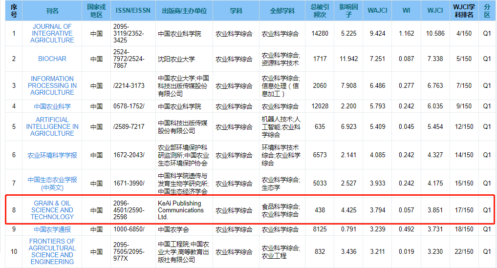 《WJCI报告》发布的期刊评价指标——“科技期刊世界影响力指数(WJCI)”是基于影响因子、总被引频次、网络浏览和下载、新媒体关注量等数据的综合评价指标。《WJCI报告》显示,《粮油科技(英文)》影响因子为 4.425,在农业科学综合学科中WJCI指数为3.851(中国期刊的WJCI指数均值为1.487),在全球农业科学综合类150种科技期刊中排名第17(在中国农业科学综合类期刊中排名第8),位于Q1区。