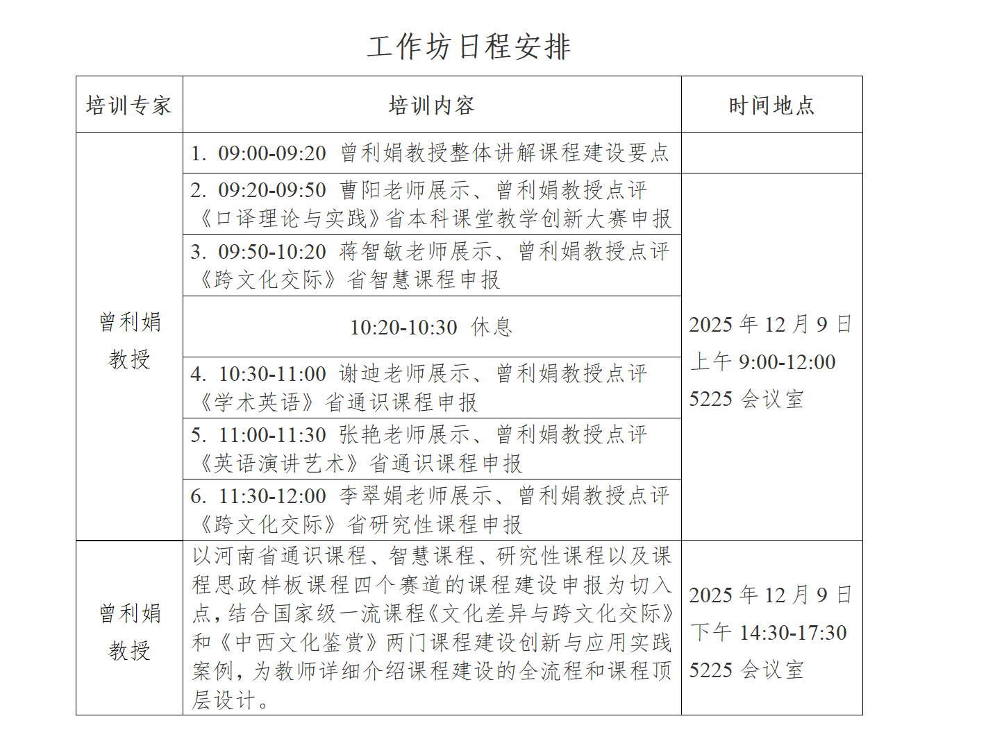本工作坊突出教学实践,将以河南省通识课程、智慧课程、研究性课程以及课程思政样板课程四个赛道的课程建设申报为切入点,结合国家级一流课程《文化差异与跨文化交际》和《中西文化鉴赏》两门课程建设创新与应用实践案例,为教师详细介绍课程建设的全流程和课程顶层设计:课程概要设计、内容设计、形象设计、拍摄设计和技术设计,从教学大纲制定、框架梳理,到脚本撰写、素材搜集、服装选择、场景确定、技术实施,再到样片拍摄,录制完成,指导教师通过课程建设开展教学改革研究,产出系列高质量教研成果。同时,结合我省教学技能竞赛、教学创新大赛以及各类外语教学大赛案例,一对一指导教师进行创新教学设计,助力教师提升智慧教学能力,提高教学水平和教学质量。